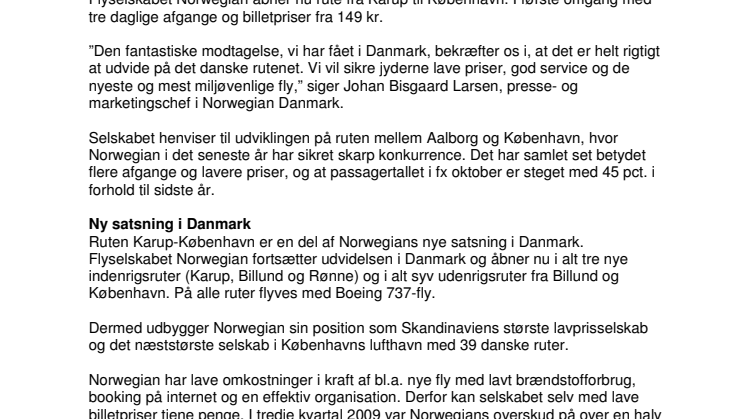 Flyselskabet Norwegian sikrer nu konkurrence på ruten Karup-København. Selskabet forventer, at det samlede antal passagerer på ruten vil stige, når forbrugerne får flere afgange og lavere priser.