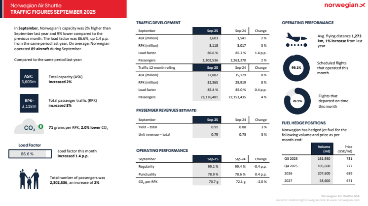 Norwegians kapacitet (ASK) i september var 3.603 millioner sædekilometer, en stigning på 2 procent fra sidste år. Den faktiske passagertrafik (RPK) var 3.118 millioner sædekilometer, en stigning på 3 procent. Belægningen var 86,6 procent, en stigning på 1,4 procentpoint. Norwegian havde i gennemsnit 89 fly i drift i september.