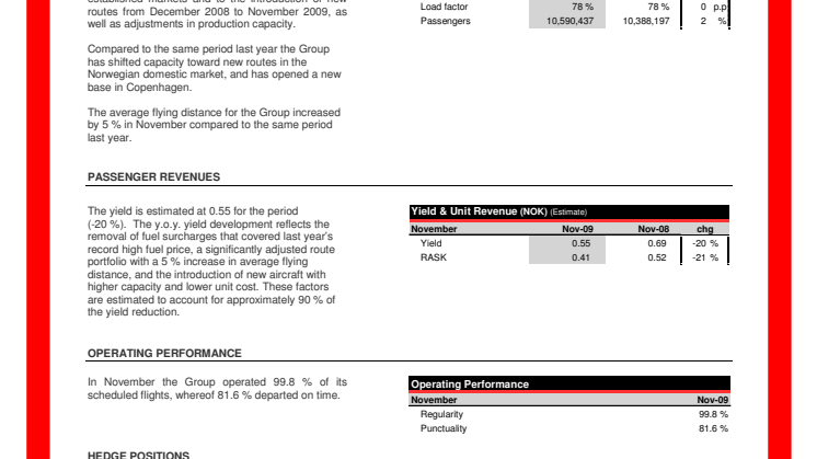 Kabinefaktoren for hele selskabet lå på 74 pct. i november mod 75 pct. sidste år. Selskabet opererede med 99,8 pct. af de planlagte flyvninger i oktober, hvoraf 82 pct. fløj som planlagt.