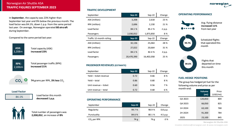 Norwegian havde 2.030.052 passagerer i september, hvilket er otte procent mere end samme måned sidste år. Kapaciteten (ASK) var 3.208 millioner sædekilometer, mens faktisk passagertrafik (RPK) var 2.696 millioner sædekilometer. I september havde Norwegian i gennemsnit 80 fly i drift, og 99,7 procent af de opsatte flyvninger blev gennemført. Bemandingsudfordringerne på London Gatwick og nationale strejker i Italien er årsag til størstedelen af de flyvninger, som ikke kunne gennemføres som planlagt. Punktligheden, målt som andel af afgange inden for 15 minutter efter ordinær tid, var 84,6 procent i september.